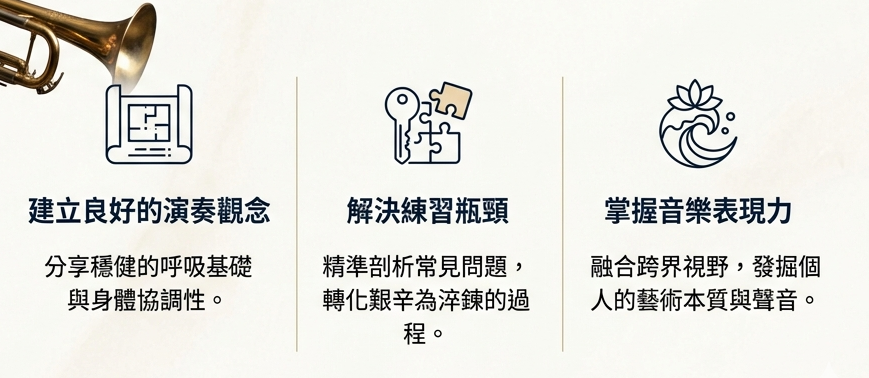 - 比起單純的技術灌輸,更重視引導學生體會吹奏時的身體感知,建立穩健且長久的演奏習慣。